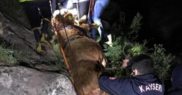 Kayseri’nin Melikgazi ilçesine bağlı Hisarcık Mahallesi Kırlangıç Vadisi’nde ayağı kırılan ve mahsur kalan bir büyükbaş hayvanı, Büyükşehir Belediyesi İtfaiye Daire Başkanlığı ekipleri 8 saat süren operasyon ile kurtardı. Ekiplerin, derenin şiddetli akıntısı ve zorlu şartlar altında büyükbaş hayvanı kurtarmak için canla, başla mücadelesi amatör kameralara da yansıdı.