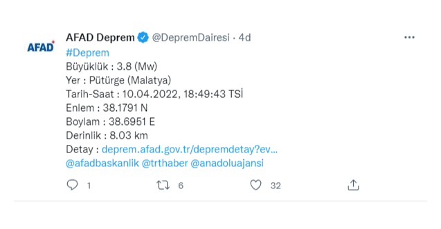 Merkez üssü Pütürge'de 3.8 büyüklüğünde deprem meydana geldi. AFAD verilerine göre, saar 18.49'da Pütürge'de 3.8 büyüklüğünde deprem yaşandı.