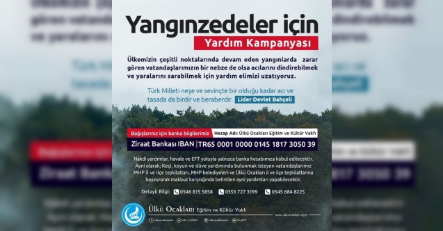’’Ülkemizin çeşitli noktalarında devam eden yangınlarda zarar gören vatandaşlarımızın bir nebzede olsa acılarını dindirebilmek için yardım elimizi uzatıyoruz. Nakdi yardımlar havale ve EFT Yoluyla yalnızca Banka hesabımıza kabul edilecektir. Aynı olarak keçi ,koyun ve düve yardımında bulunmak isteyen vatandaşlarımız MHP İl ve İlçe Teşkilatları, MHP Belediyeleri ve Ülkü Ocakları İl ve İlçe Teşkilatlarına başvurarak makbuz karşılığında belirtilen ayni yardımları yapabilecektir.’’