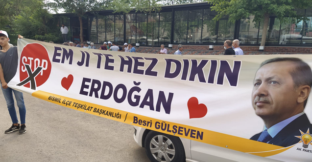 New York'taki Times Meydanı'nda terör örgütü FETÖ’nün yayınlattırdığı ‘Stop Erdoğan’ yazılı aşağılık kampanyaya karşı Diyarbakır Bismil İlçe Teşkilatı sessiz kalmadı. Terör örgütü FETÖ’ye, AK Parti Bismil İlçe Teşkilat Başkanı Besri Gülseven, Cumhurbaşkanı Recep Tayyip Erdoğan’ın Diyarbakır ziyaretinde Kürtçe pankartla cevap verdi. Destek pankartında Kürtçe, ‘Em Ji Te hez dıkım’ ‘Seni seviyoruz Erdoğan’ anlamına gelen dev pankart açıldı.