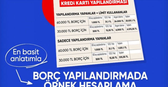 Yeni alınan kararlara göre, 60 bin lira borcu olan biri bu borcunu yapılandırarak her ay 1.000 TL ödeyecek. Bu takside yüzde 3,11 faiz eklenecek. Borçlunun ilk ödeyeceği taksit böylelikle 1.031,1 lira olacak. Bu borcu asgari ödeme tutarı olan (yüzde 40) 24 bin liraya eklenecek ve ilk ay 25 bin 31,1 lira ödenmesi gerekecek.