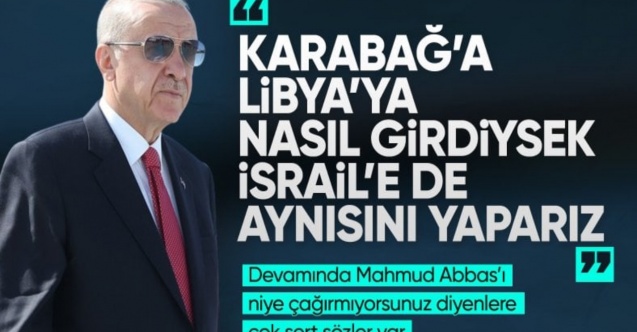 İsrail'in Gazze'deki katliama değinen Erdoğan, Karabağ ve Libya'dan örnek vererek "Benzerini aynen onlara da yaparız. Yapmamak için hiçbir şey yok. Sadece biz güçlü olmalıyız ki bu adımları atalım. Biz çok güçlü olmalıyız ki, bu İsrail Filistin'e bunu yapamasın." dedi.