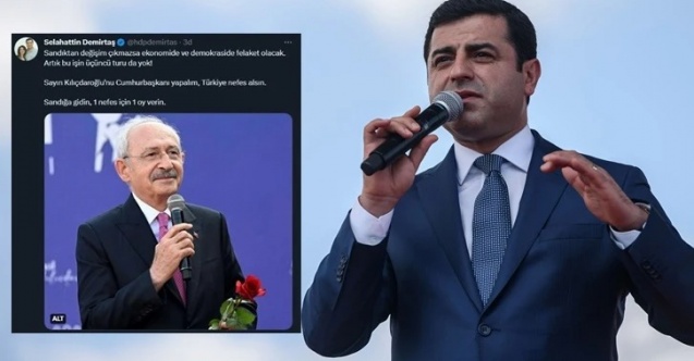 Demirtaş Twitter'dan yaptığı açıklamada, "Sandıktan değişim çıkmazsa ekonomide ve demokraside felaket olacak. Artık bu işin üçüncü turu da yok! Sayın Kılıçdaroğlu'nu Cumhurbaşkanı yapalım, Türkiye nefes alsın. Sandığa gidin, 1 nefes için 1 oy verin."