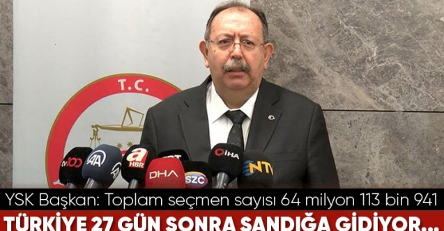 Yüksek Seçim Kurulu Başkanı Ahmet Yener, 14 Mayıs'taki seçimlerde yurt içi ve yurt dışında toplam 64 milyon 113 bin 941 seçmenin oy kullanacağını açıkladı.