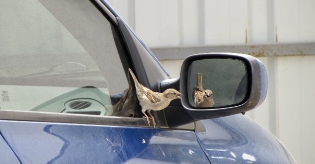 Çanakkale’de bir serçenin otomobilin yan aynasında kendisiyle oyunu görenleri gülümsetti.