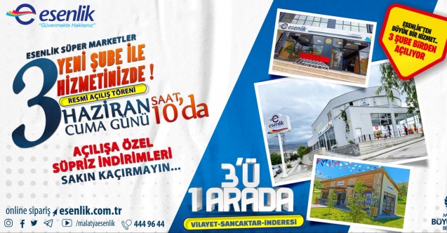 Bir günde 3 şube açılışı yaparak Malatya'da bir ilki gerçekleştireceklerini kaydeden Esenlik A.Ş Genel Müdür Ata Ünlü, Malatyalıları Cuma günü saat 10.00'daki açılışa davet ederek, "Cuma, Cumartesi ve Pazar günlerinde açılışa özel indirimler uygulayacağız. Malatyalı hemşerilerimizin bu indirimlerden faydalanmasını diliyorum. Hemşerilerimiz bize güvenmeye, bizimle olmaya devam ederler" dedi.