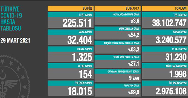 Sağlık Bakanlığı, son 24 saatte 154 kişinin korona virüsten hayatını kaybettiğini, 32 bin 404 yeni vaka sayısının olduğu açıkladı. Sağlık Bakanlığının Covid-19 bilgilendirme sayfasında Türkiye’nin güncel korona virüs tablosu kamuoyuyla paylaşıldı. Tabloya göre son 24 saatte 154 kişi korona virüsten hayatını kaybetti, toplam can kaybı 31 bin 230’a yükseldi. Toplamda 38 milyon 102 bin 747 test yapıldı. Bugün yapılan 225 bin 511 testten, 32 bin 404 yeni vaka sayısı, bin 325 kişi de yeni hasta sayısı olduğu belirtildi. Toplam vaka sayısının 3 milyon 240 bin 577 olduğu, bugün iyileşen 18 bin 15 kişiyle birlikte toplam iyileşen hasta sayısının 2 milyon 975 bin 108’e yükseldiği, toplam hastalarda zatürre oranının yüzde 3,6, ağır hasta sayısının ise bin 998 olduğu açıklandı.