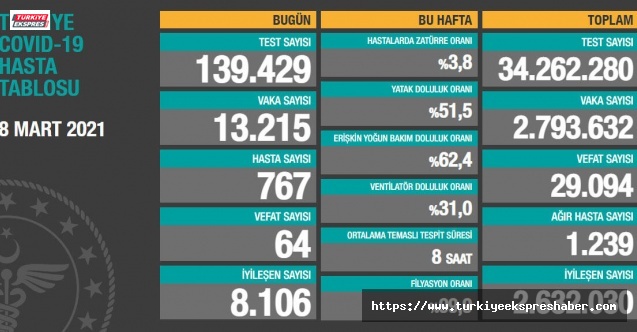 Sağlık Bakanlığının Covid-19 bilgilendirme sayfasında Türkiye’nin güncel korona virüs tablosu kamuoyuyla paylaşıldı. Tabloya göre son 24 saatte 64 kişi korona virüsten hayatını kaybetti, toplam can kaybı 29 bin 94’e yükseldi. Toplamda 34 milyon 262 bin 280 test yapıldı. Bugün yapılan 139 bin 429 testten 13 bin 215 yeni vaka sayısı, 767 de yeni hasta sayısı olduğu belirtildi. Toplam vaka sayısının 2 milyon 793 bin 632 olduğu, bugün iyileşen 8 bin 106 kişiyle birlikte toplam iyileşen hasta sayısının 2 milyon 632 bin 30’a yükseldiği, toplam hastalarda zatürre oranının yüzde 3,8, ağır hasta sayısının ise bin 239 olduğu açıklandı.