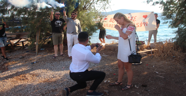 Muğla’nın Bodrum ilçesinde bir genç, tersanede kız arkadaşına sürpriz evlilik teklifi yaptı. Teklifine ‘evet’ yanıtını alan genç, büyük mutluluk yaşadı.