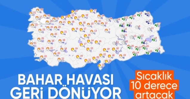 Önümüzdeki hafta ortasına kadar sıcaklıklar, Ankara'da 16, İstanbul'da 19, İzmir'de 21, Antalya'da 25, Adana'da 25, Diyarbakır'da 16, Samsun'da 14 dereceye kadar yükselecek.