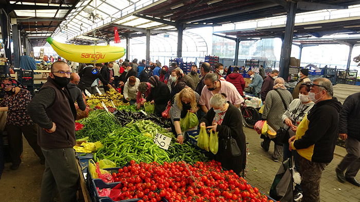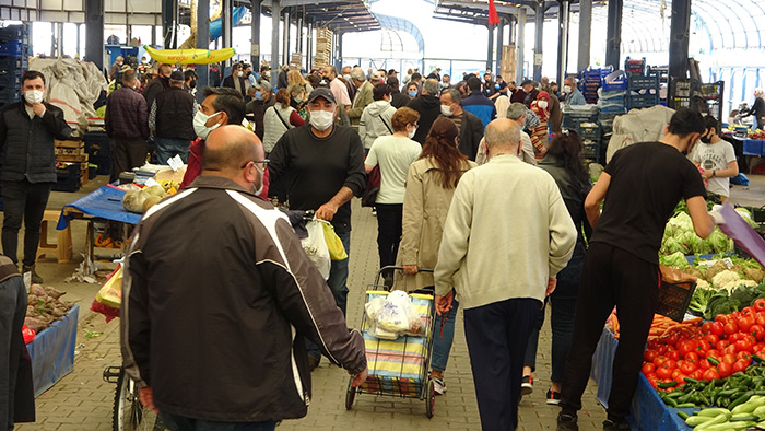 Çanakkale’nin, Türkiye genelinde yayınlanan korona virüs risk haritasında birinci sıraya çıkmasının ardından yeni kararlar alınmasına rağmen halk pazarında maske ve sosyal mesafe kuralı hiçe sayıldı. Sağlık Bakanı Fahrettin Koca tarafından yayınlanan ‘İllere Göre Haftalık Vaka Sayısı’ tablosunda 100 bin kişide görülen vaka sayısının bir haftada 797,34’ten 962,928’e yükselen Çanakkale, bu artış hızıyla Türkiye birinciliğine yükseldi. Çanakkale'de vaka sayıları, 8 Şubat'tan 16 Nisan’a kadar geçen süreçte vaka sayıları 26 kat arttı. Korkutan artışlar sonrası Çanakkale Valisi İlhami Aktaş öncülüğünde toplanan İl Umumi Hıfzıssıhha Kurulu, yeni ek tedbir kararları aldı. İçişleri Bakanlığı tarafından dün akşam saatlerinde gönderilen 23 Nisan Sokağa Çıkma Kısıtlaması konulu genelgede, 23 Nisan Ulusal Egemenlik ve Çocuk Bayramı'nın resmi tatil olması dolayısıyla sokağa çıkma kısıtlaması, bugün saat 19.00 itibarıyla başlayacak ve Pazartesi günü saat 05.00’te sonra erecek. Normalde yarın kurulması gereken halk pazarı 3 günlük sokağa çıkma kısıtlamasının ardından bugün kuruldu. Haberi duyan vatandaşlar soluğu halk pazarında alındı. Maske, mesafe ve hijyen kurallarının hiçe sayıldığı pazardaki görüntüyü görenler tedirginliklerini gizleyemedi.