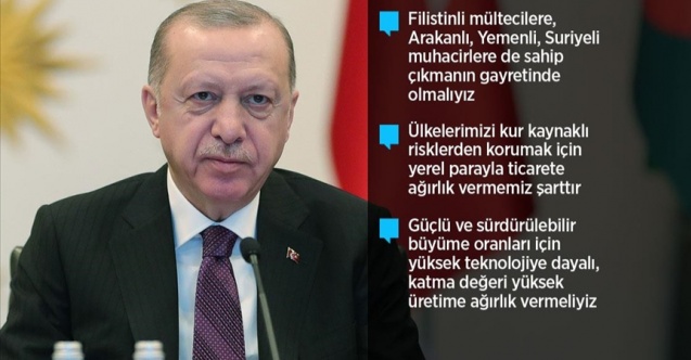 "Ülkelerimizin en prestijli üniversitelerinin dahil olduğu 'D-8 Araştırma ve İnovasyon Öncüleri Ağı' girişimini memnuniyetle karşılıyoruz. Yenilenebilir enerji, yapay zeka, robotik, nesnelerin interneti, büyük veri, blok zincir ve nanoteknoloji gibi yenilikçi alanlarda üniversitelerimiz ve araştırma kurumlarımız arasında bilgi paylaşımını mümkün kılan bu ağ, ülkelerimizin hak ettiği yere ulaşması bakımından kritik önemdedir. Ülkelerimizi kur kaynaklı risklerden korumak için yerel parayla ticarete ağırlık vermemiz şarttır. D-8'i günümüzün ihtiyaçlarına göre yenilemeli, proje ve sonuç odaklı bir yapıya dönüştürmeli, karar alma süreçlerini hızlandıracak adımlar atmalıyız. İslami finans kurumlarının likidite ihtiyaçlarını ve Müslüman coğrafyanın artan altyapı finansman ihtiyaçlarını aynı anda karşılayacak ve online platforma dayalı bir İslami Megabank fikrinin de yapılabilir olduğuna inanıyoruz. 2017 yılındaki İstanbul Zirvemizde, yerel paralarımızla ticaret yapma çağrısında bulunduğum hatırlanacaktır. Geçtiğimiz dört yılda yaşananlar, bu çağrının isabetini ispatladı. Zulümle, yoksullukla mücadele eden Filistinli mültecilere, Arakanlı, Yemenli, Suriyeli muhacirlere de sahip çıkmanın gayretinde olmalıyız"