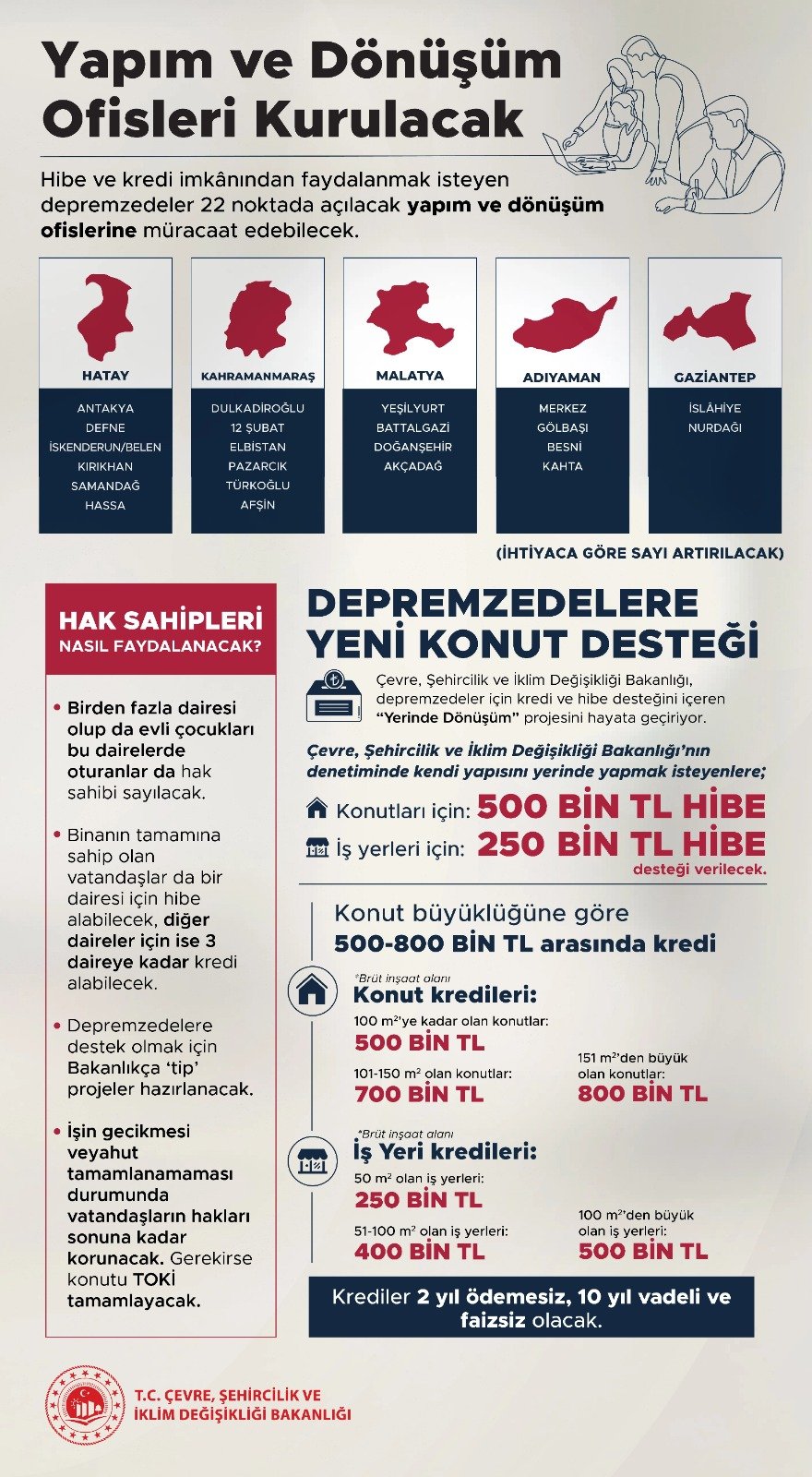 Konutlar için 500 bin TL, işyerleri için ise 250 bin TL hibe verilecek. Konut büyüklüklerine göre 500 bin TL ile 800 bin TL arasında ve işyeri büyüklüklerine göre de 250 bin TL ile 500 bin TL arasında da kredi kullanabilecek.