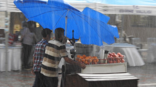 Meteoroloji Genel Müdürlüğünün Trakya Bölgesi için günlerdir uyarılarda bulunduğu sağanak yağış, Edirne’de kısa sürede etkili oldu. Akşam saatlerinde fırtınanın ardından başlayan sağanak yağış 15 dakika sürdü. Yağmura hazırlıksız yakalanan vatandaşlar zor anlar yaşadı. Birçok vatandaş işyerlerinin içine girerek yağmurdan korunmaya çalıştı. Yağmura hazırlıksız yakalanan vatandaşlar tarihi çarşılara sığınırken, kimisi çareyi şal, kimisi ise şemsiye satın almakta buldu.