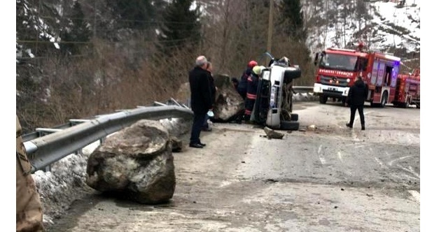Tonya ilçesinin Karaağaçlı mahallesinde sürücüsü henüz belirlenemeyen 60 KF 334 plakalı aracın üzerine seyir halindeyken yamaçtan kopan dev bir kaya parçası düştü.