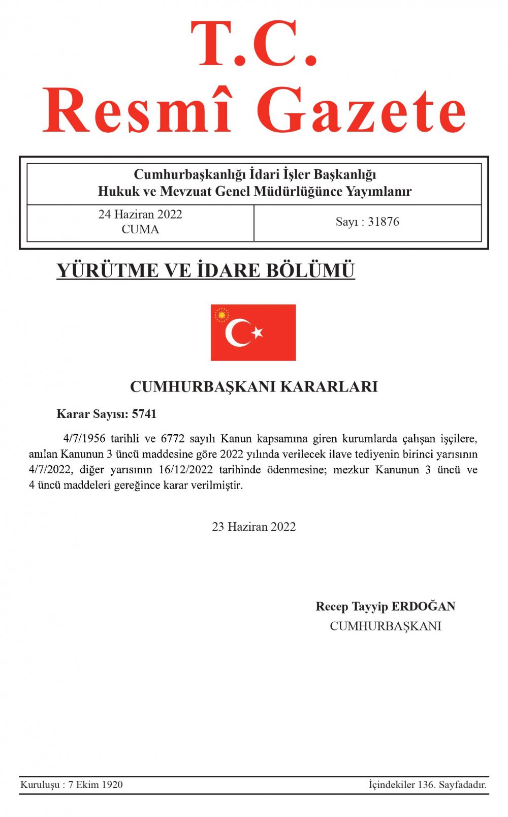 24/06/2022 Tarih ve 31876 Sayılı Resmi Gazete ‘de Yayınlanan “4/7/1956 tarihli 6772 sayılı Kanun kapsamına giren kurumlarda çalışan işçilere 2022 yılında verilecek ilave tediyenin sürelerinin belirlenmesi hakkında karar” başlıklı Cumhurbaşkanı Kararı ile 6772 sayılı Kanun kapsamındaki kurumlarda çalışan işçilere ödenecek ilave tediye tarihleri belirlenmiş oldu. Buna göre, 2022 yılı bir ve ikinci taksitleri 28/01/2022 ve 29/04/2022 tarihlerinde, ödenen ilave tediyelerin üç ve dördüncü taksitleri de 4 Temmuz 2022 ve 16 Aralık 2022 tarihlerinde ödenecek.