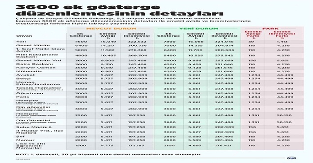 Birinci dereceye gelmiş olmak şartıyla tüm öğretmenlerin, 2 yıl ve üzeri yükseköğrenim mezunu polislerin, alan sınırlaması olmaksızın 2 yıl ve üzeri yükseköğrenim mezunu tüm sağlık çalışanı ve din görevlilerinin ek göstergeleri 3600'e yükseltildi. Avukat, il müdürü, bekçi, uzman jandarma ve uzman erbaş gibi 3000 ek göstergeli tüm meslek gruplarının da 3600 ek gösterge düzenlemesinden faydalanmaları sağlandı. İl müdür yardımcısı, ilçe müdürü, şube müdürü, gelir uzmanı ve mali hizmetler uzmanları gibi kariyer uzmanları ile denetmenlerin de 2200 olan ek göstergeleri 3600 ek göstergeye çıkarıldı. Temmuz 2022 itibarıyla ek göstergesi 3000'den 3600'e çıkan ve 30 yıllık hizmeti olan birinci derecedeki bir memurun emekli aylığında 1728 lira, emekli ikramiyesinde ise 62 bin 299 lira artış olacak. Temmuz itibarıyla birinci derecedeki 3000 ek göstergeli öğretmen, sağlık çalışanı, din görevlisi, avukat ve matematikçi gibi unvanlarda görev yapanların emekli aylığı 7 bin 878 liradan 9 bin 605 liraya, emekli ikramiyesi ise 284 bin 73 liradan 346 bin 371 liraya çıkacak.