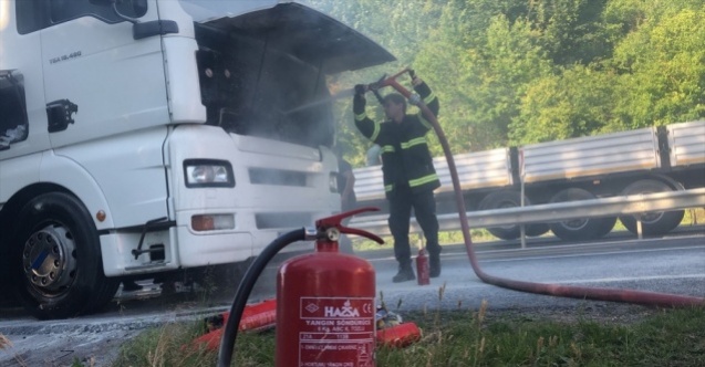 Yangını fark eden sürücü, tırı durdurarak araçtan indi.