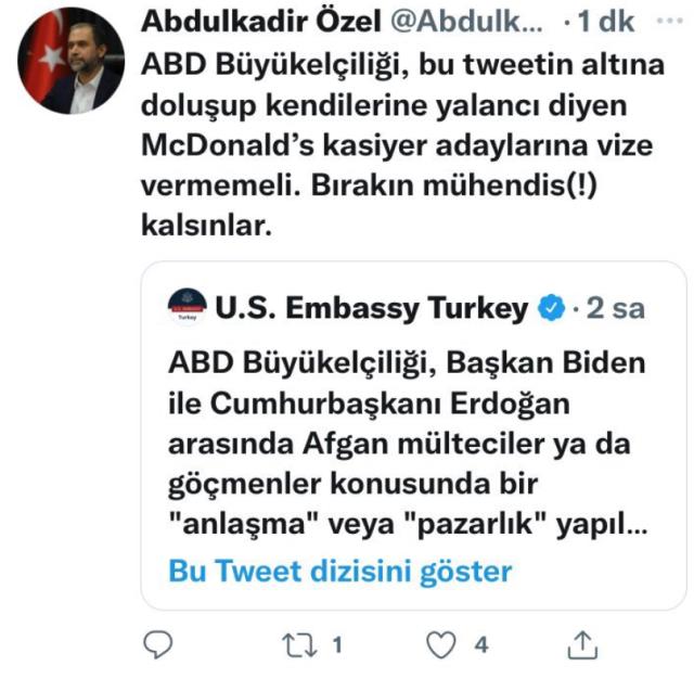 Bu açıklamanın yalan olduğuna dair gelen eleştirilere kızan AK Parti Hatay Milletvekili Abdulkadir Özel, sosyal medya hesabından dikkat çeken bir paylaşıma imza atıp eleştiride bulunanları "McDonalds kasiyer adayları" olarak tanımladı.