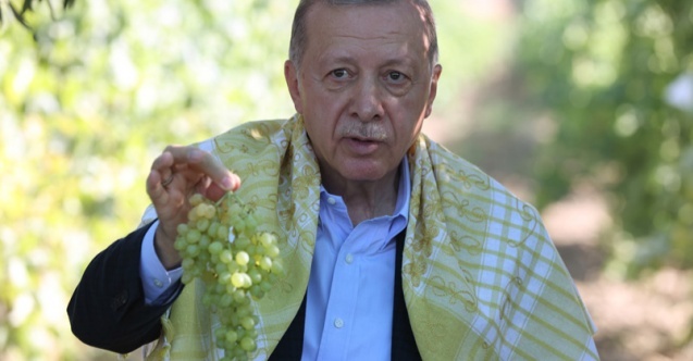 Manisalı çiftçilere toplam 4 milyar lira tutarında tarımsal destek verildiğini vurgulayan Cumhurbaşkanı Erdoğan, şunları söyledi: "Bugün buraya gelmeden önce bir üzüm bağını ziyaret ettim. Bu vesileyle hasat dönemi gelen her ürün gibi bölgemizin en önemli gelir kaynaklarından olan Sultani çekirdeksiz üzümün alım fiyatını da şimdi sizlerle paylaşmak istiyorum. Alım fiyatlarını hasat döneminin başında ilan etmemizin sebebi, üreticimizin emeğinin hakkını alabilmesini sağlamak, herhangi bir istismara meydan vermemektir. Ülkemize yılda 500 milyon dolarlık ihracat geliri kazandıran 9 numaralı Sultani çekirdeksiz kuru üzümü Toprak Mahsulleri Ofisimiz, yani biz çiftçi kardeşlerimizi mağdur ve mahrum etmeyiz. Yani geçen yıl bu 13 liraydı değil mi? Şimdi bu yıl da Cumhurbaşkanınız, bütün arkadaşlarımızla değerlendirmelerimizi yaptık ve fiyat olarak hem güçlü devlet hem güçlü çiftçi olarak fiyatımızı 27 lira olarak belirledik. Nasıl bereketli mi, elhamdülillah yani sizin bu bereketiniz var ya sizin bu samimiyetiniz var ya sizin bu ihlasınız var ya inşallah üzümlerde ki bereketi de ne yapacaktır, artıracaktır. İnşallah şöyle iki gün içerisinde üzümlerimizi toparlayıp, bir hafta içinde de kurutup hemen yola koyulalım ve ihracatımızı da buna göre yapalım. Ya Allah bismillah diyelim. Kuru üzüm fiyatımızın üreticilerimize, ihracatçılarımıza ve ülkemize hayırlı olmasını diliyorum."