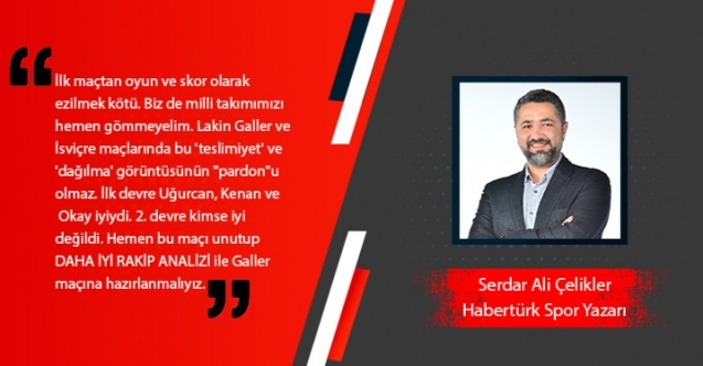 İlk maçtan oyun ve skor olarak ezilmek kötü. Biz de milli takımımızı hemen gömmeyelim. Lakin Galler ve İsviçre maçlarında bu 'teslimiyet' ve 'dağılma' görüntüsünün "pardon"u olmaz. İlk devre Uğurcan, Kenan ve Okay iyiydi. 2. devre kimse iyi değildi. Hemen bu maçı unutup DAHA İYİ RAKİP ANALİZİ ile Galler maçına hazırlanmalıyız.