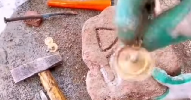 Defineci, dedektörle belirlediği yeri önce kazmayla kazdıktan sonra elleriyle eşelemeye devam ediyor. Define avcısı, bir süre sonra hedefine ulaşarak toprağın altındaki taşı çıkarmayı başarıyor. Fakat sosyal medya kullanıcılarının asıl dikkatini çeken ise taşın içerisinden çıkan çok sayıda altın oluyor.