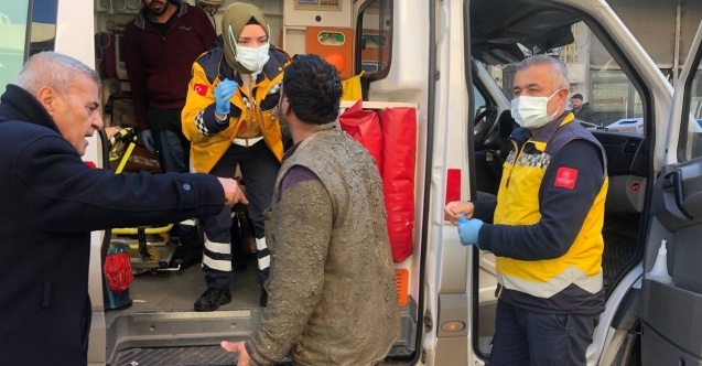 Sağlık çalışanının yaralı işçiyi ambulansa bindirmek için ikna etmeye çalıştığı anlar görüntüye yansırken işçinin üzerinin betondan dolayı kirlendiğini gösterip “Bir şeyim yok” diyerek binmek istememesi izleyenlerin yüreğini burktu.