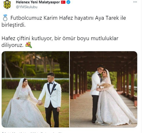 Yeni Malatyaspor’un 25 yaşındaki Mısırlı futbolcusu Karim Hafez, hayatını Aya Tarek ile birleştirdi. Yeni Malatyaspor da sosyal medya hesabından yaptığı paylaşımla çiftini kutladı. Kulübün söz konusu kutlama paylaşımında, “Futbolcumuz Karim Hafez hayatını Aya Tarek ile birleştirdi. Hafez çiftini kutluyor, bir ömür boyu mutluluklar diliyoruz” ifadelerini kullandı.