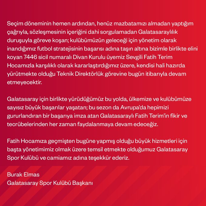 Galatasaray’da Teknik Direktör Fatih Terim ile yollar ayrıldı. Böylelikle Terim’in sarı-kırmızılıların başında 4. dönemi de sona erdi.