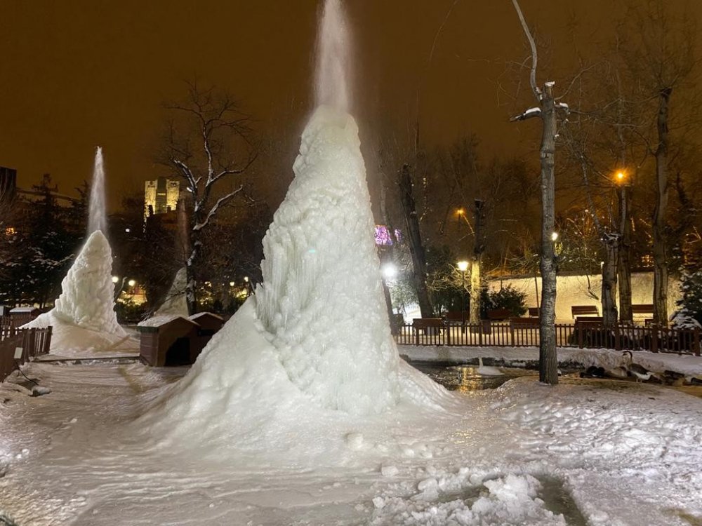 Ankara’nın simge yeri olan Kuğulu Park havuzunda bulunan fıskiyelerden çıkan suyun donması sonucu 4 metre uzunluğunda buz kütleleri oluştu