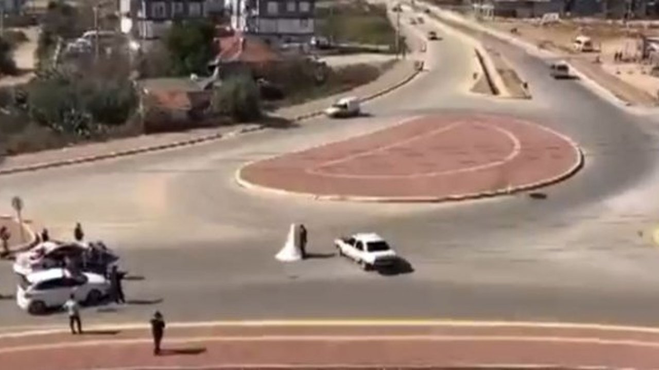 Antalya’da sosyal medyada paylaşılan bir görüntü büyük tepki topladı. Kepez ilçesi Sütçüler Mahallesi’nde çekildiği belirtilen görüntülerde düğün konvoyunda bulunan bir kişi kavşakta trafiği durdurdu. Sürücü daha sonra gelin ve damadı aşağı indirerek etrafında uzun süre drift attı. Gelin ve damadın büyük tehlike atlattığı o anlar cep telefonu kamerası tarafından kayda alındı.