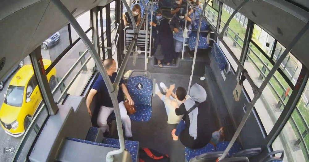 Frenin etkisiyle savrulan kadın yolcu, otobüsün içerisinde yere düştü.