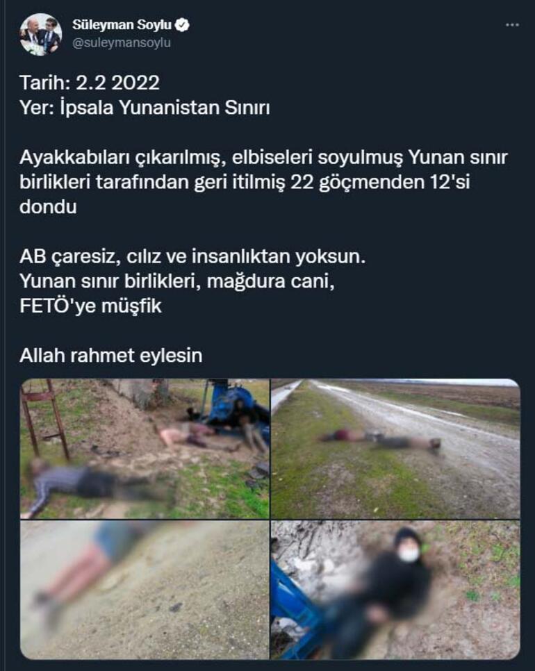 İçişleri Bakanı Süleyman Soylu “Ayakkabıları çıkarılmış, elbiseleri soyulmuş Yunan sınır birlikleri tarafından geri itilmiş 22 göçmenden 12’si dondu. AB çaresiz, cılız ve insanlıktan yoksun. Yunan sınır birlikleri, mağdura cani, FETÖ’ye müşfik. Allah rahmet eylesin” açıklamasında bulundu.