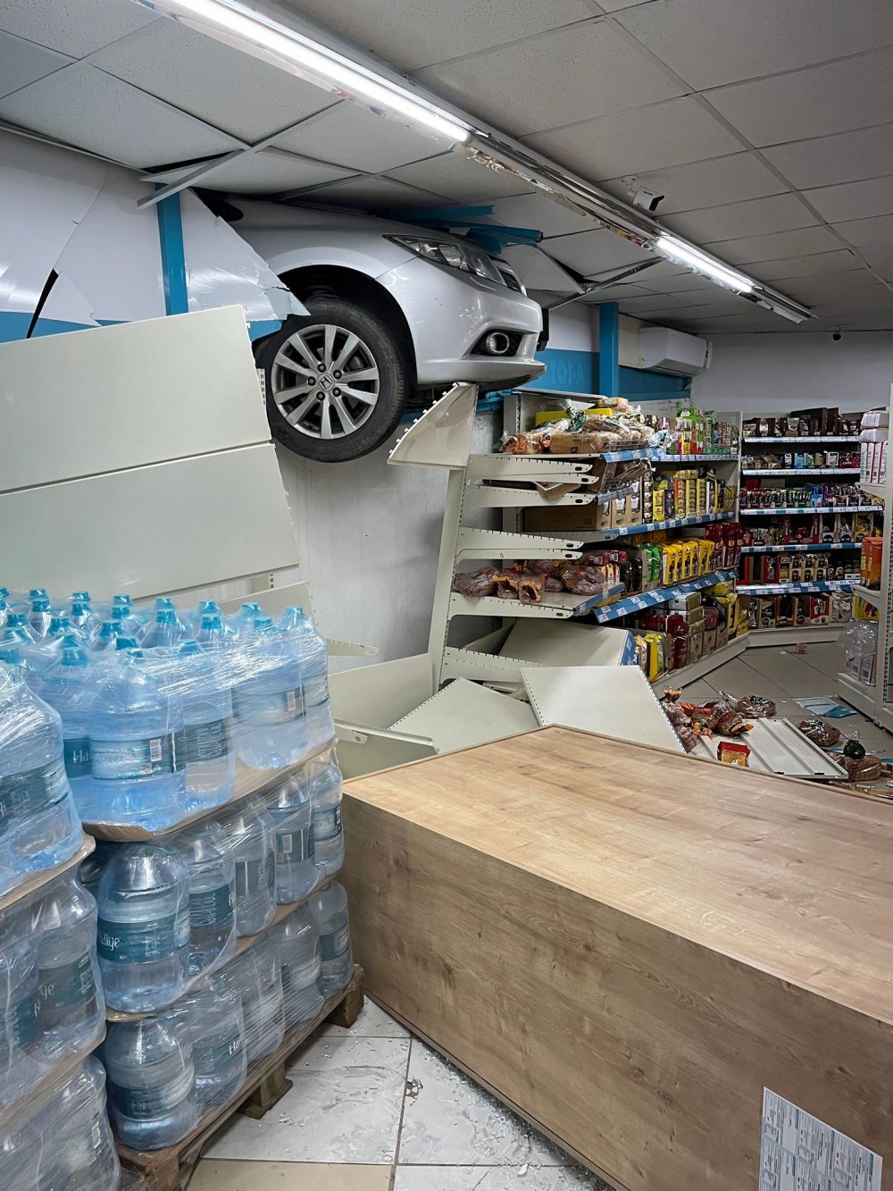 Öte yandan kontrolden çıkan otomobilin markete daldığı anlar güvenlik kamerasına saniye saniye yansıdı.