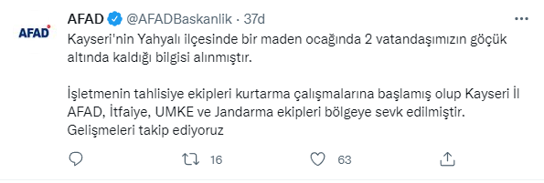 "Kayseri'nin Yahyalı ilçesinde bir maden ocağında 2 vatandaşımızın göçük altında kaldığı bilgisi alınmıştır. İşletmenin tahlisiye ekipleri kurtarma çalışmalarına başlamış olup Kayseri İl AFAD, İtfaiye, UMKE ve jandarma ekipleri bölgeye sevk edilmiştir. Gelişmeleri takip ediyoruz" bilgisi verildi.
