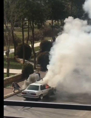 Cep telefonu kamerasına yansıyan görüntülerde ise gençlerin aracın kapısını açtıktan sonra siyah dumanların çıktığı bir kişinin ise yangın söndürme tüpüyle müdahale etmeye çalıştığı görüldü.