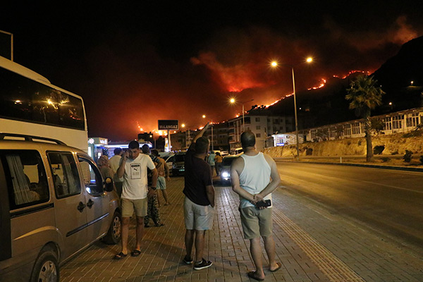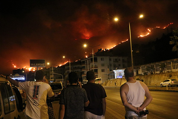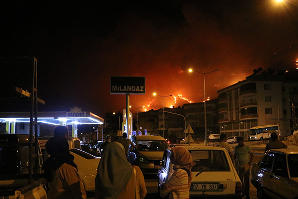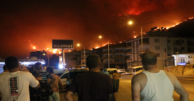 Mersin'in Aydıncık ilçesinde çıkan orman yangını devam ederken, yerleşim yerlerini tehdit eden yangından dolayı Cumhuriyet Mahallesi’ndeki evler boşaltıldı. Yangından kaçan vatandaşlar belediye önünde toplandı.