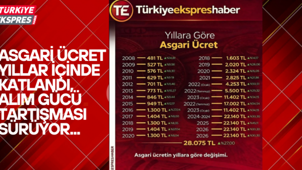 2024 ve 2025 yıllarında ise 22 bin TL’nin üzerine çıkan asgari ücret, yüzde 27’lik son artışla 28.075 TL oldu.
