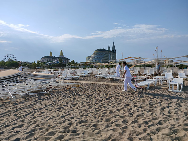Kısa süren ancak etkili olan hortumun ardından sahilde savrulan gölgelik ve şezlonglar otel görevlileri tarafından toplanarak yeniden düzenleme yapıldı.