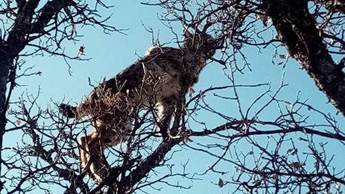 Uluslararası Doğaya Koruma Birliği (IUCN) kırmızı listesinde yer alan vaşak, Tunceli'nin merkeze bağlı Çukur köyünde Kangal köpeklerden kaçarak bir ağacın tepesine tırmandı.