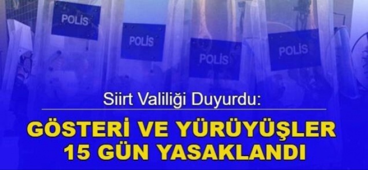 Siirt Valiliğinden yapılan açıklamada, “Türk Silahlı Kuvvetlerimiz tarafından Suriye ve Irak’ta faaliyet gösteren terör örgütlerine yönelik devam eden operasyonlar ve ülkemizde son zamanlarda meydana gelen terör eylemleri göz önünde bulundurularak terör örgütleri elemanlarınca veya sempatizanlarınca şiddet içerikli eylemler, protesto eylemleri, korsan gösteriler yapılabileceği değerlendirilerek; milli birlik ve beraberliğimizi zedeleyici provokatif eylemlerin önüne geçilebilmesi, milli güvenlik, kamu düzeni ve güvenliğinin tesisi, can ve mal güvenliğinin, kişi dokunulmazlığının, tasarrufa müteallik emniyetin ve kamu esenliğinin sağlanması, Cumhuriyetin temel nitelikleri ve devletin ülkesi ve milleti ile bölünmez bütünlüğünün korunması, olası yasa dışı eylemlerin önlenerek müessif olayların yaşanmaması amacıyla valilik ve kaymakamlık makamlarının uygun göreceği etkinlikler ile kamu kurum ve kuruluşlarının düzenleyeceği programlar, resmi bayram, resmi anma günleri, resmi tören ve kutlamalar ile bu kurumlarının gelenek ve göreneklere göre yapacakları programlar, spor faaliyetleri hariç olmak üzere her türlü açık yer toplantıları ile gösteri yürüyüşleri, toplu olarak karşılama ve uğurlama merasimleri, kurum ve kuruluşların kendi binası dışında yapacakları basın açıklaması, oturma eylemi, miting, çadır kurma, imza kampanyası, stant açma, kitlesel cenaze merasimi, anma töreni, şenlik, konser, eğlence, oyun temsili, gösteri türdeki tüm eylem ve etkinlikler, ses yayın araçları ile yapılabilecek her türlü sesli ve görsel faaliyetler, dilek feneri - balon uçurtmak, dron, paramotor gibi her türlü hava faaliyetleri ile ticari kimliği bulunan özel hukuk tüzel kişilerinin ticari faaliyetleri hariç olmak üzere el ilanı, sticker, broşür dağıtılması, afiş ve pankart asılması, etkinliklerin ayrıca kanunsuz bir şekilde yapılması planlanan her türlü eylem ve etkinliğe katılmak üzere toplu veya münferit bir şekilde ilimize gelecek olan araç ve şahısların il sınırlarına girişlerinin; kamu düzeni ve güvenliğinin olağan hayatı durduracak veya kesintiye uğratacak şekilde bozulacağına ilişkin ciddi belirtilerin bulunduğu hususu göz önüne alındığında can ve mal güvenliğini, kişi dokunulmazlığını, tasarrufa müteallik emniyetin ve kamu esenliğinin sağlanmasının güçleşeceği gerekçesi ile açık alanlarda yukarıda anlatılan konular çerçevesinde yapılabilecek her türlü eylemin il ve ilçe mülki sınırlarımız içerisinde 2911 Sayılı Toplantı ve Gösteri Yürüyüşleri Kanunu'nun 17. ve 19. maddeleri ile 5442 Sayılı İl İdaresi Kanunu'nun 11/A, B ve C maddeleri gereğince 15 Nisan 2023 günü saat 00.01'den 29 Nisan 2023 günü saat 23.59'a kadar 15 gün süreyle yasaklanmıştır” denildi.