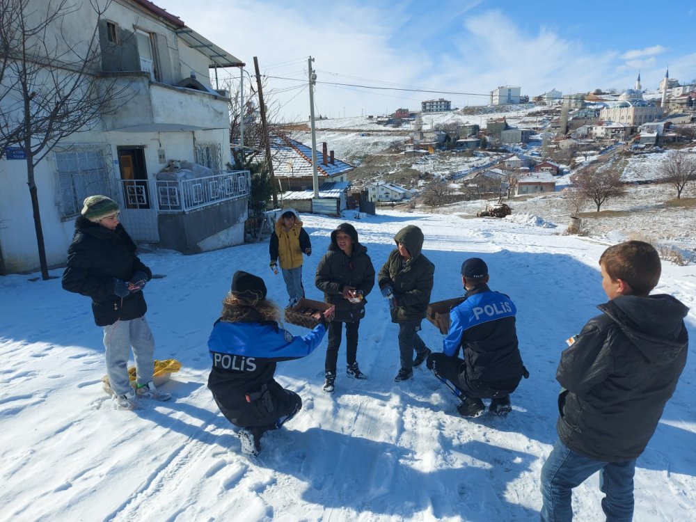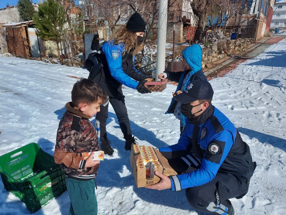 Karlı havada kontrol amaçlı Elmalıdere Mahallesi’ne giden Uşak polisi, poşet yardımıyla kayan çocuklara arkadaş olarak beraber kaydılar. Oynanılan oyunun ardından ekipler çocuklara kek ve meyve suyu dağıttı. Yürekleri ısıtan bu davranış Emniyet Genel Müdürlüğü sosyal medya hesabından paylaşıldı.