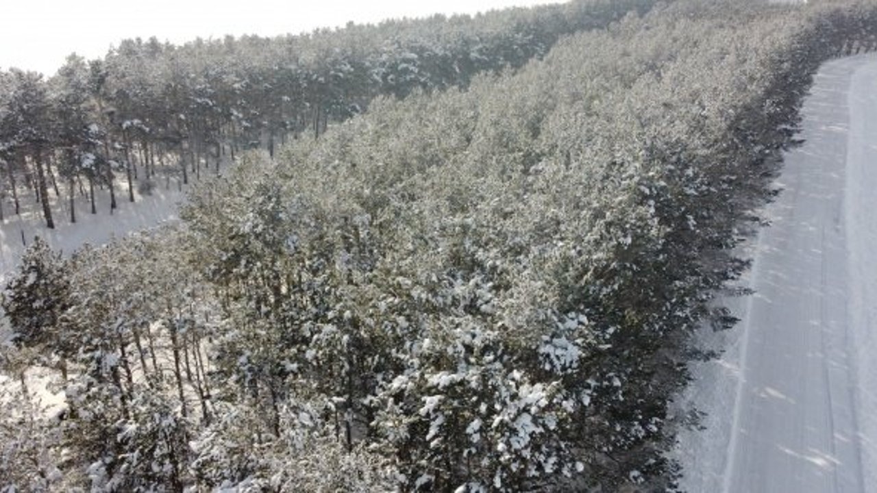 4 mevsim ayrı güzelliği bürünen tarihi Benliahmet Tren İstasyonu beyazlar içerisinde havadan görüntülendi. Beyaz ile gökyüzünün mavisiyle bütünleşen çam ağaçları görsel şölen oluşturdu.