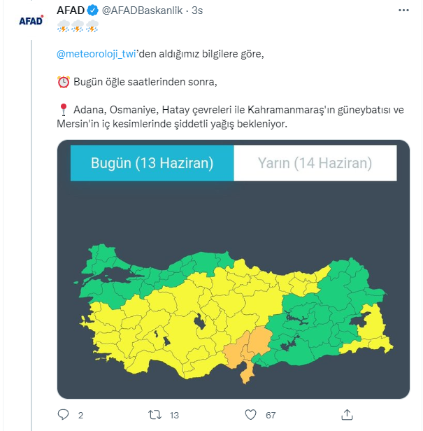 AFAD tarafından yapılan paylaşımda ülke genelinde yaşanabilecek yağışlara karşı uyarıda bulunuldu. Açıklamada, "Bugün öğle saatlerinden sonra, Adana, Osmaniye, Hatay çevreleri ile Kahramanmaraş'ın güneybatısı ve Mersin'in iç kesimlerinde şiddetli yağış bekleniyor" ifadelerine yer verildi.