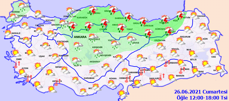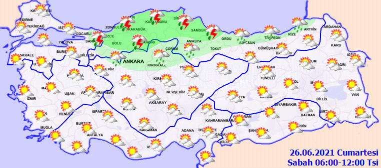 Meteoroloji Genel Müdürlüğü tarafından yapılan son değerlendirmelere göre: Ülkemizin kuzey ve iç kesimleri parçalı yer yer çok bulutlu, Trakya kesimi, İç Anadolu’nun kuzeyi, Karadeniz ile Sakarya, Konya, Aksaray, Nevşehir ve Erzincan çevrelerinin yerel olmak üzere sağanak ve gök gürültülü sağanak yağışlı, diğer yerlerin az bulutlu ve açık geçeceği tahmin ediliyor.