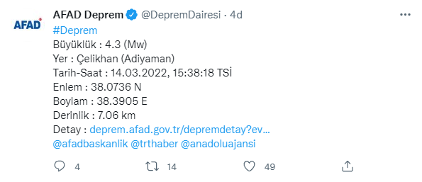 AFAD sosyal medya hesabında yer alan bilgiye göre, Çelikhan'da gerçekleşen deprem saat 15.38'de 7 kilometre derinliğinde gerçekleşti.