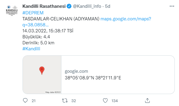 Kandilli Rasathanesi ve Deprem Araştırma Enstitüsü'nün sosyal medya hesabında yer alan bilgiye göre, Taşdamlar - Çelikhan'da gerçekleşen deprem saat 15.38'de 5 kilometre derinliğinde gerçekleşti.