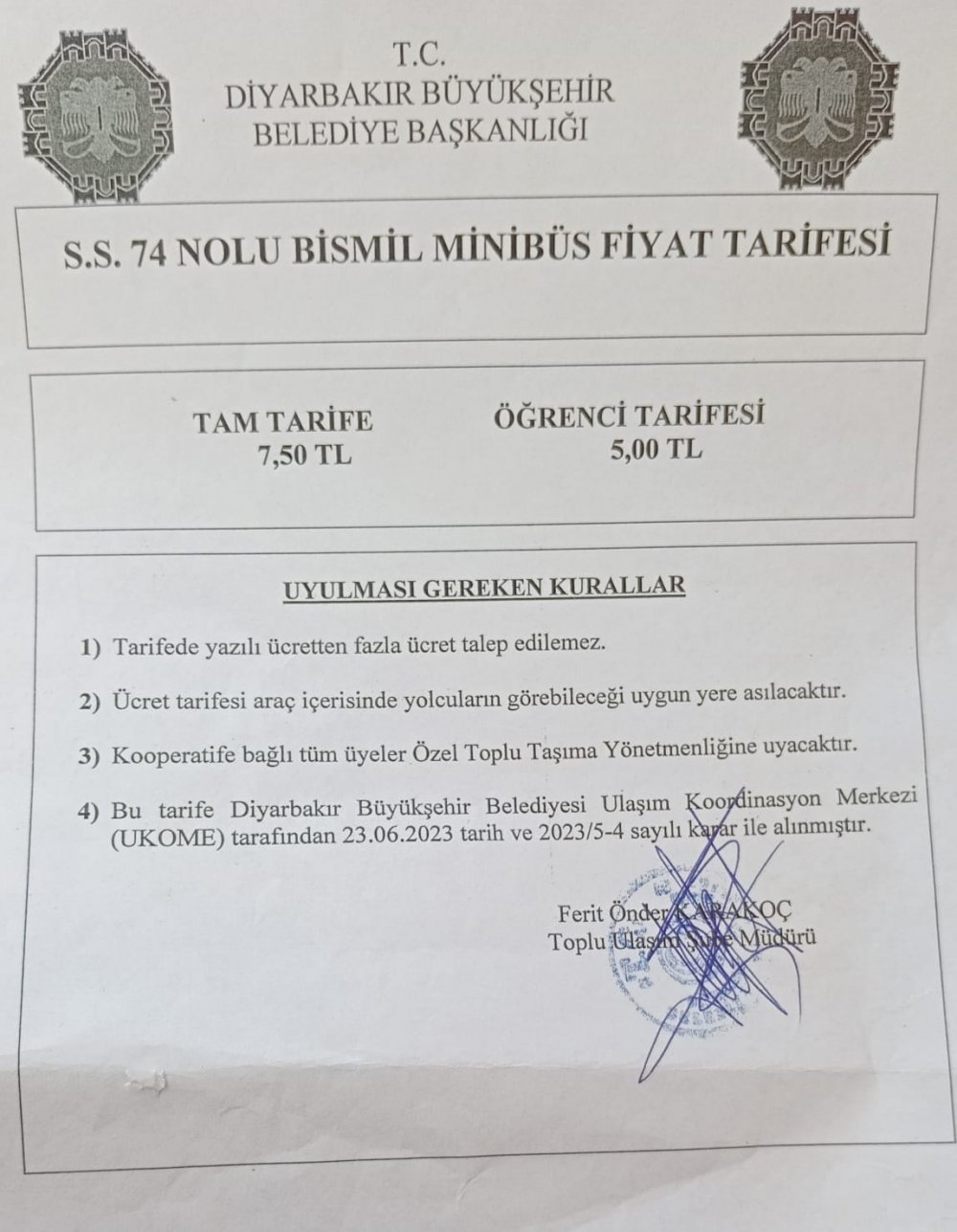 Diyarbakır Büyükşehir Belediyesi Başkanlığı'nca yapılan açıklamada, Bismil’de toplu ulaşım araçlarına zam yapıldı.