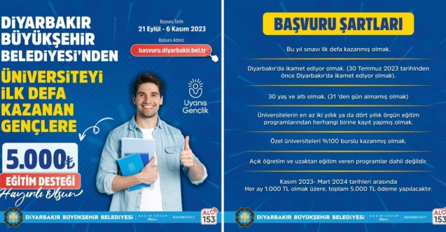 Büyükşehir Belediyesinden yapılan açıklamaya göre, üniversiteyi kazanan Diyarbakırlı gençlerin eğitim hayatına katkı sunmak amacıyla, bu yıl için 2 yıllık veya 4 yıllık herhangi bir örgün eğitime kayıt olan Diyarbakırlı gençlere Kasım 2023- Mart 2024 tarihleri arasında her ay 1000 TL olmak üzere toplamda 5000 TL eğitim desteği vereceğini duyurdu.