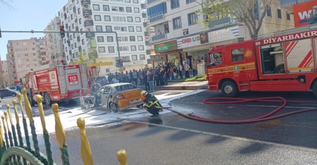 Diyarbakır'ın Bağlar ilçesinde seyir halinde olan bir ticari taksi aniden alev alarak yandı. Can kaybının olmadığı yangında ticari taksi kullanılmaz hale geldi.